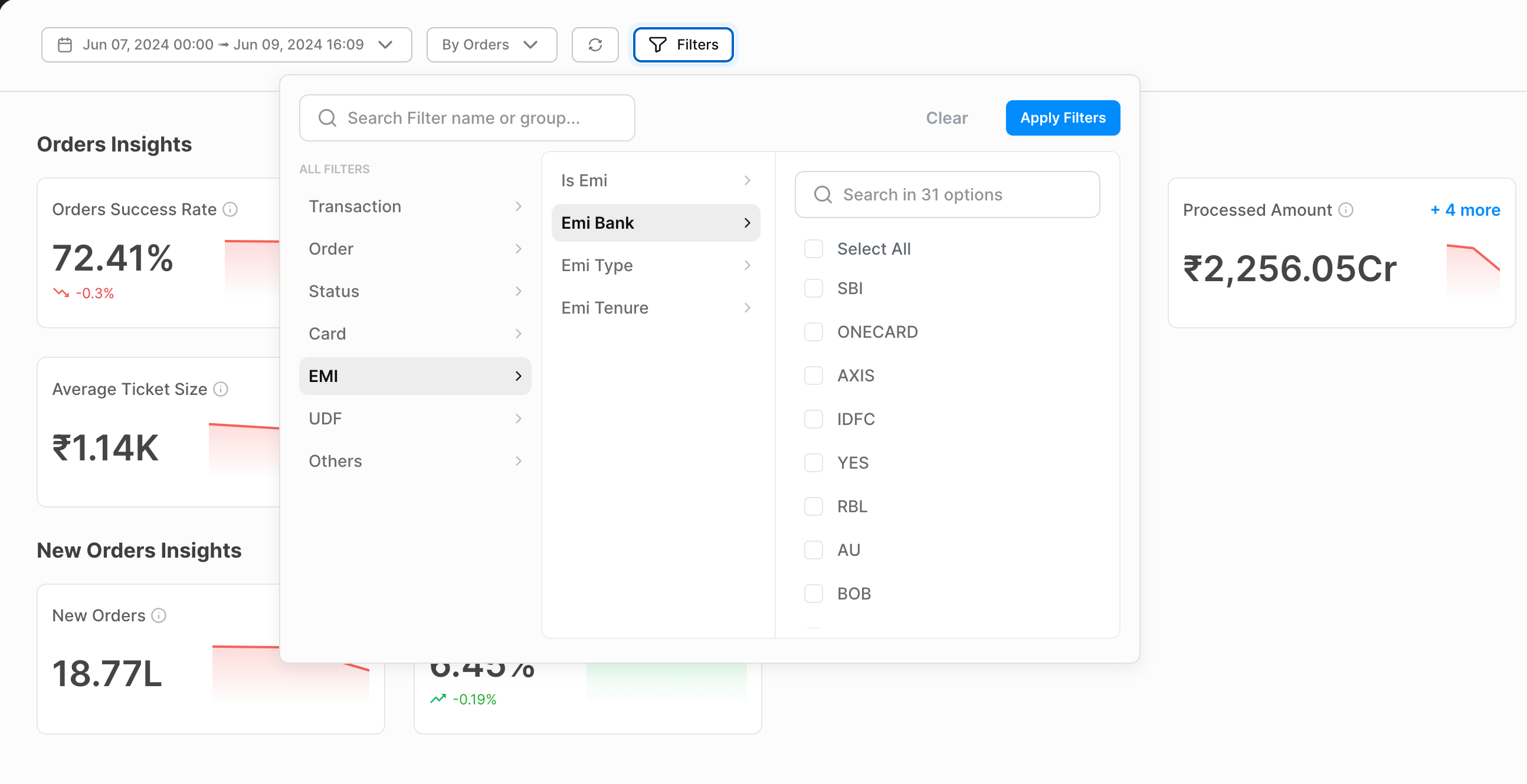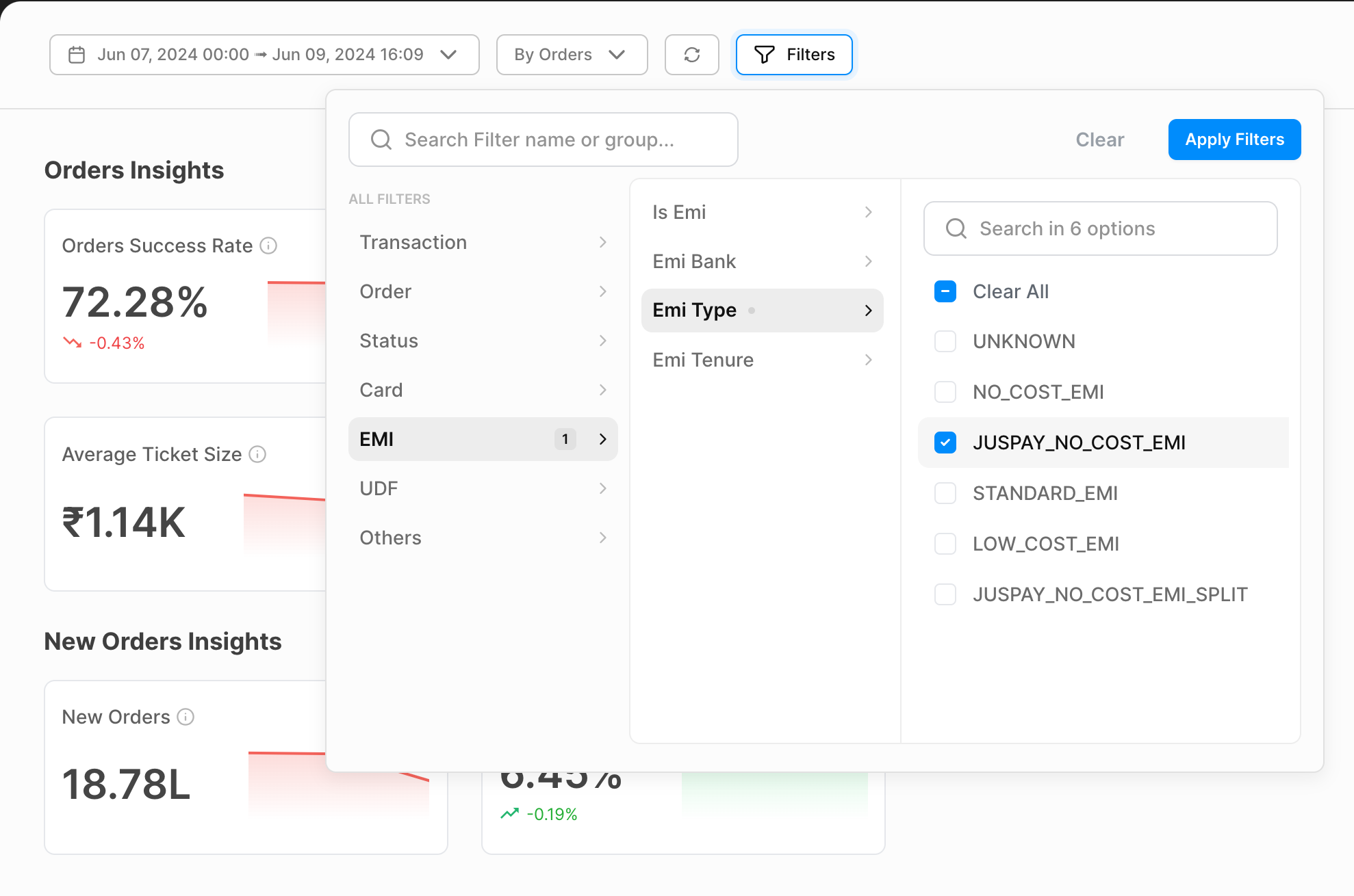 Use the filter EMI Type with values as STANDARD_EMI /JUSPAY_NO_COST_EMI / JUSPAY_LOW_COST_EMI to check for the EMI transactions traffic and the performance.