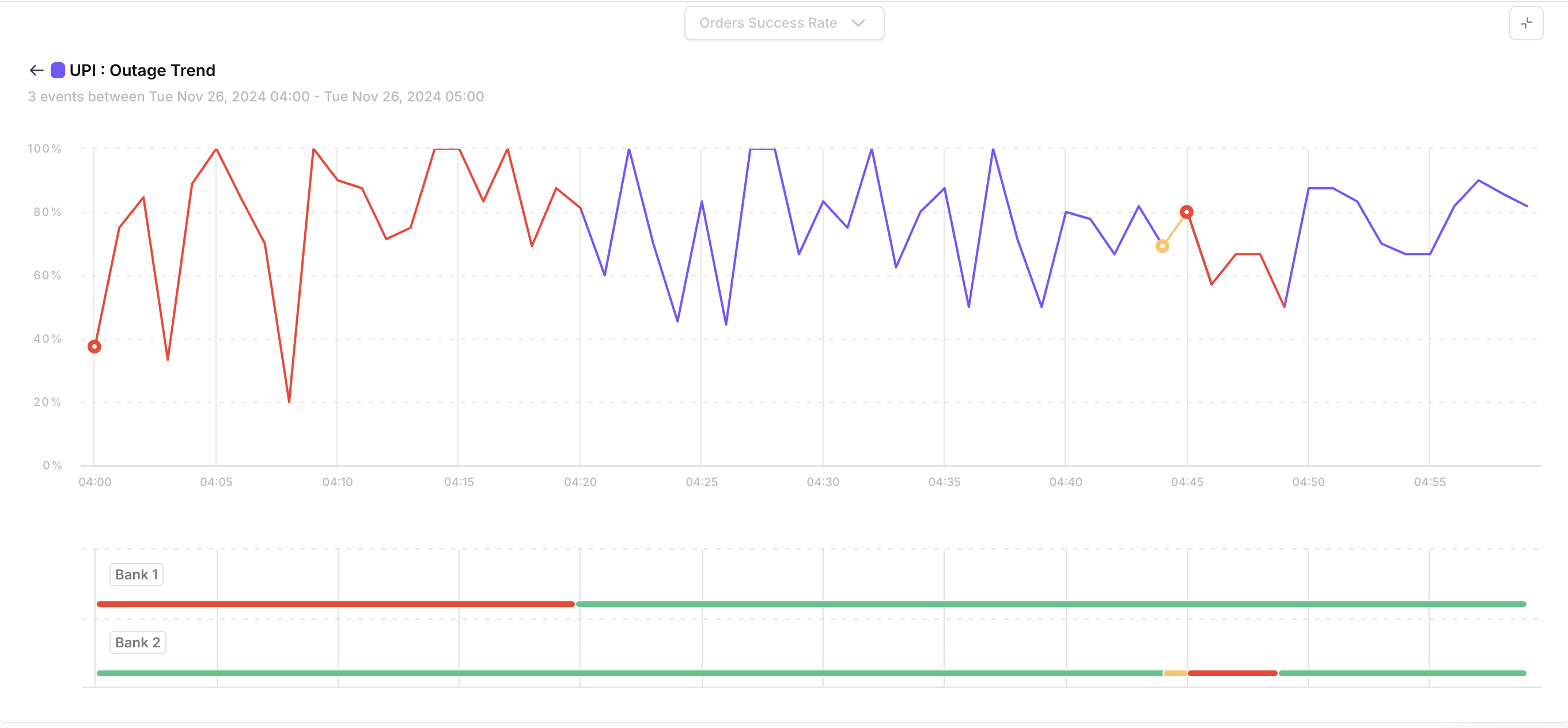Merchants often notice fluctuations in their success rates and seek to understand the underlying cause. One common reason could be the downtime of specific banks or payment methods. This feature provides a visual representation of such correlations, enabling merchants to quickly diagnose issues and take necessary actions.