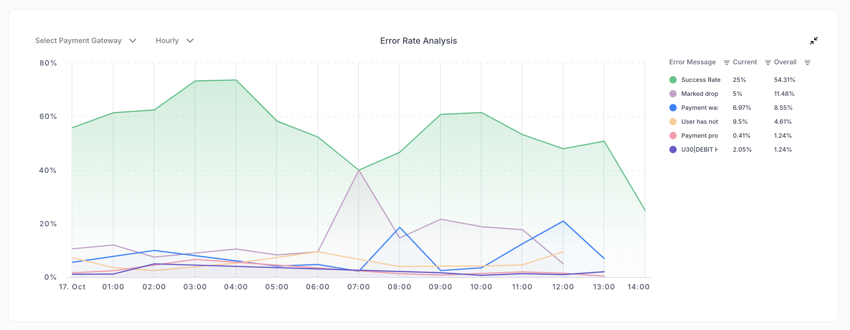 Our advanced graph provides a visual representation of error messages, enabling you to identify trends and patterns in real time. As you monitor your success rate, the graph allows you to determine if there are any spikes in error messages that coincide with drops in success. This correlation is crucial for diagnosing potential issues within your system.