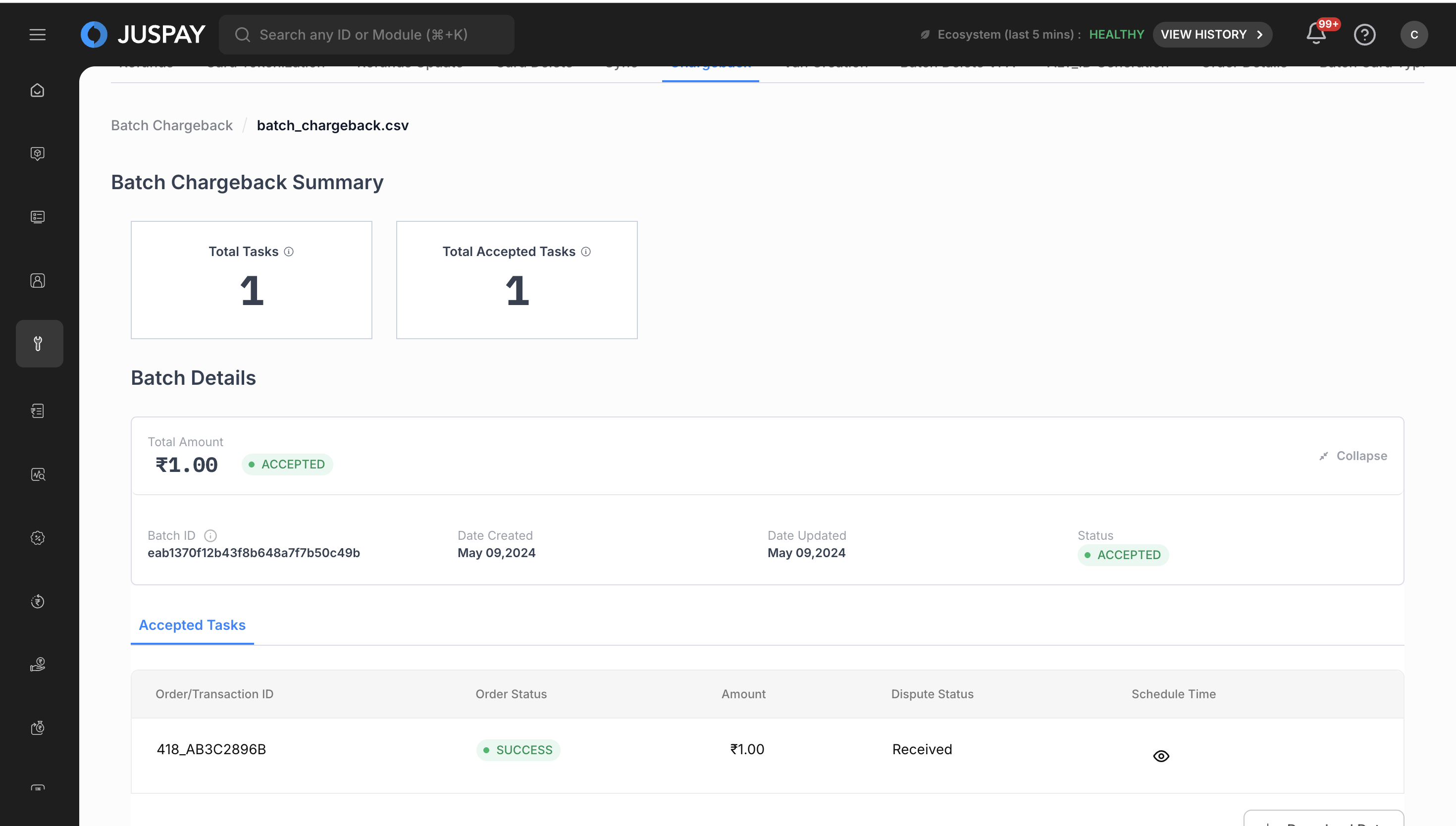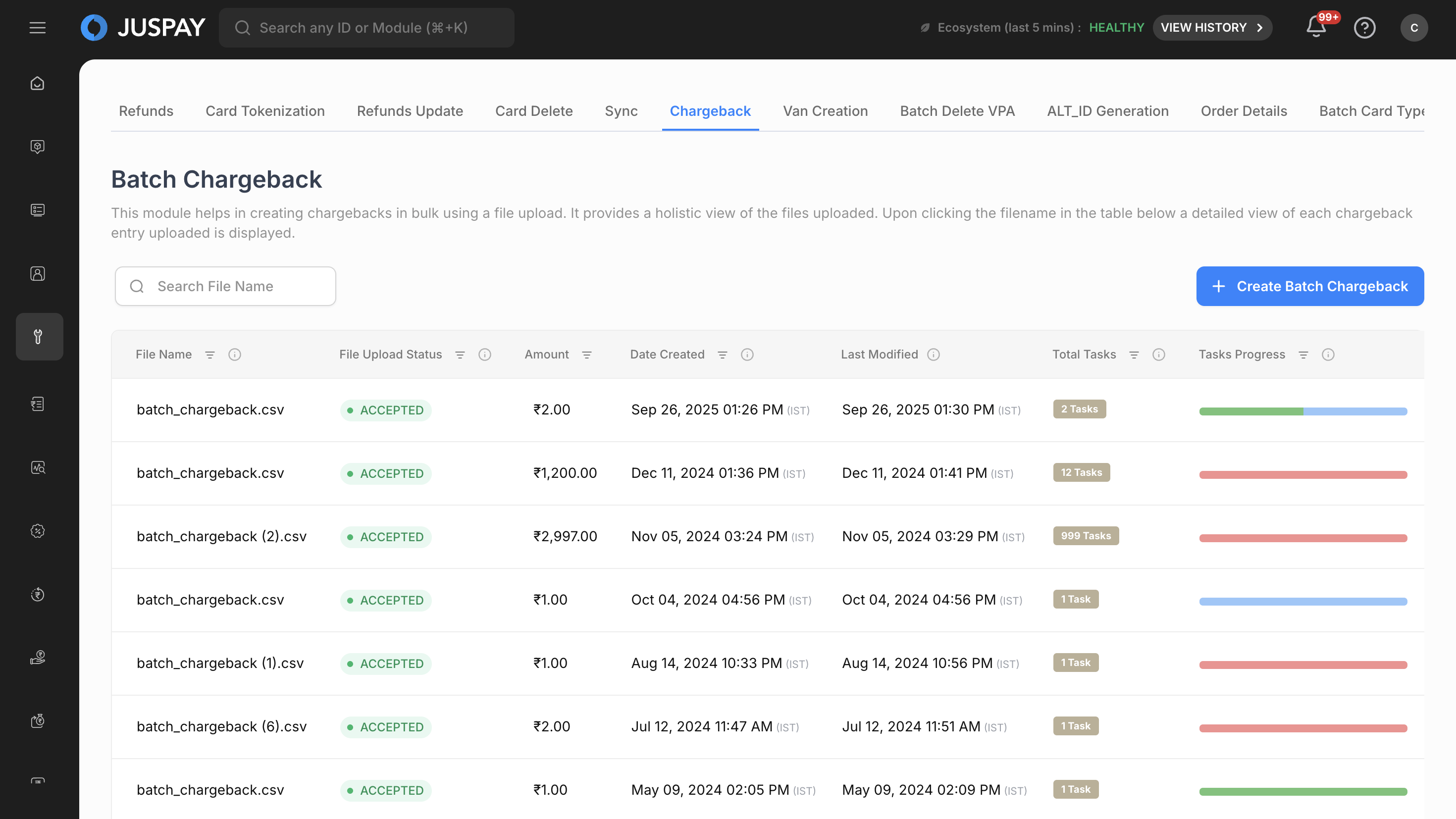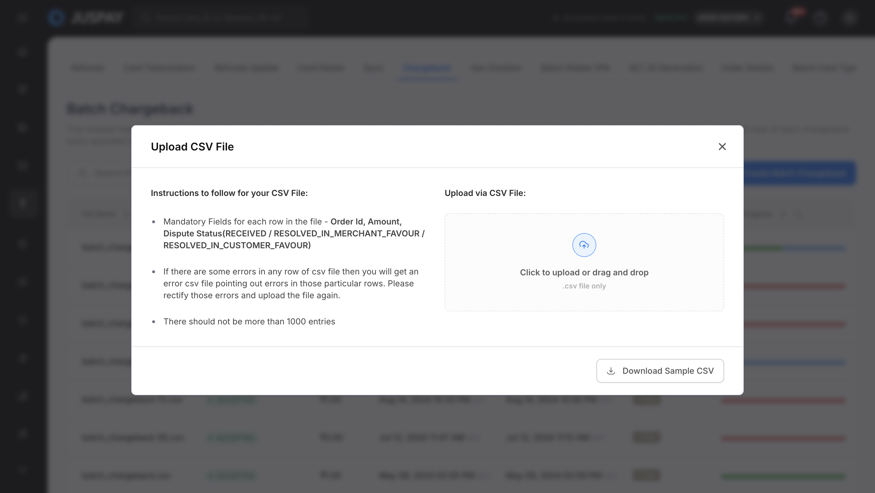 The Batch Chargeback module provides comprehensive bulk chargeback processing capabilities for handling multiple dispute and chargeback records simultaneously through CSV file uploads. It offers real-time progress tracking, status monitoring, and detailed reporting for all chargeback operations processed through the Juspay payment platform.