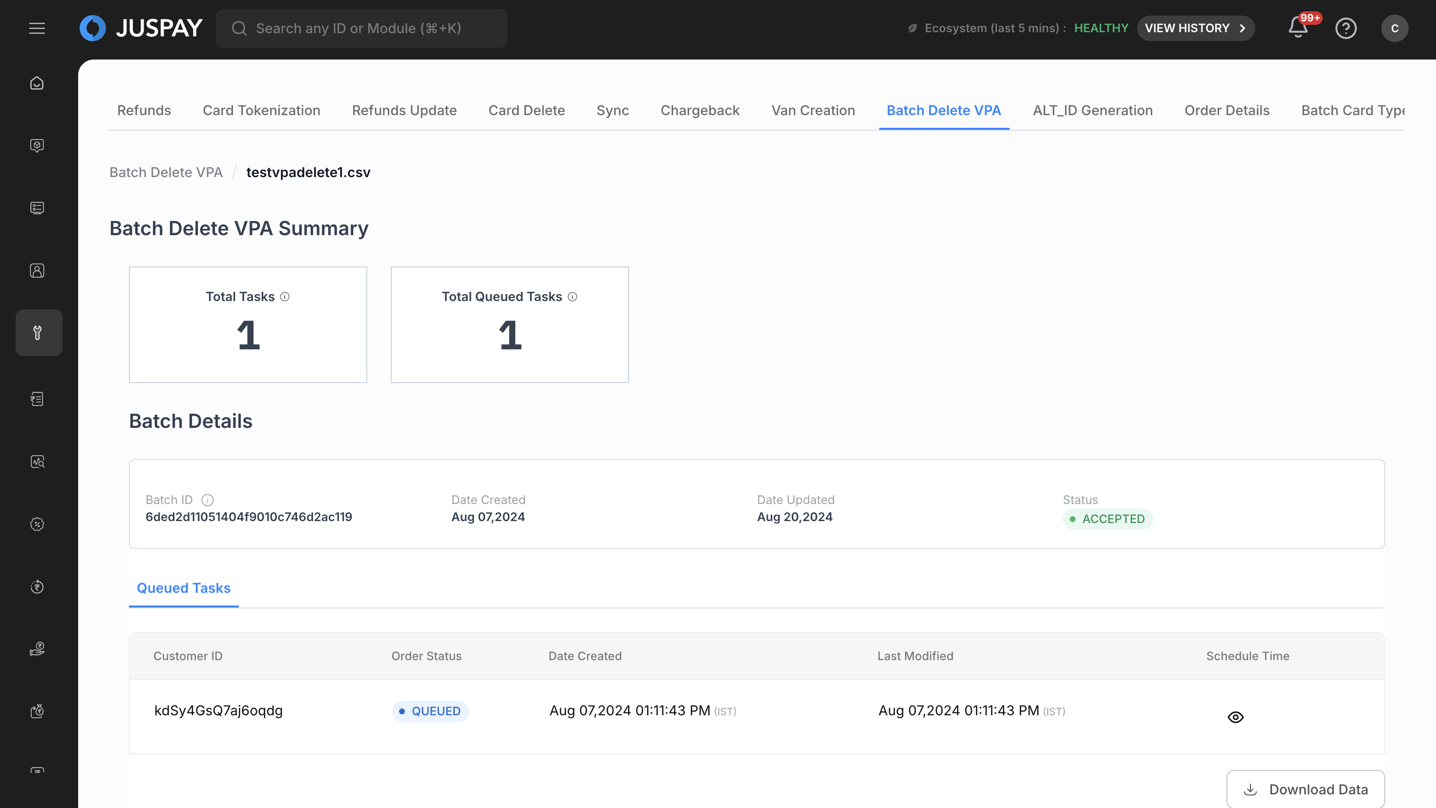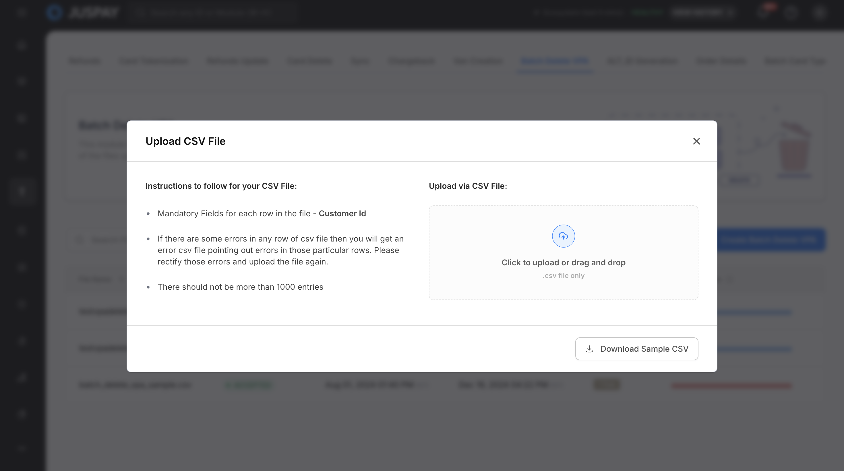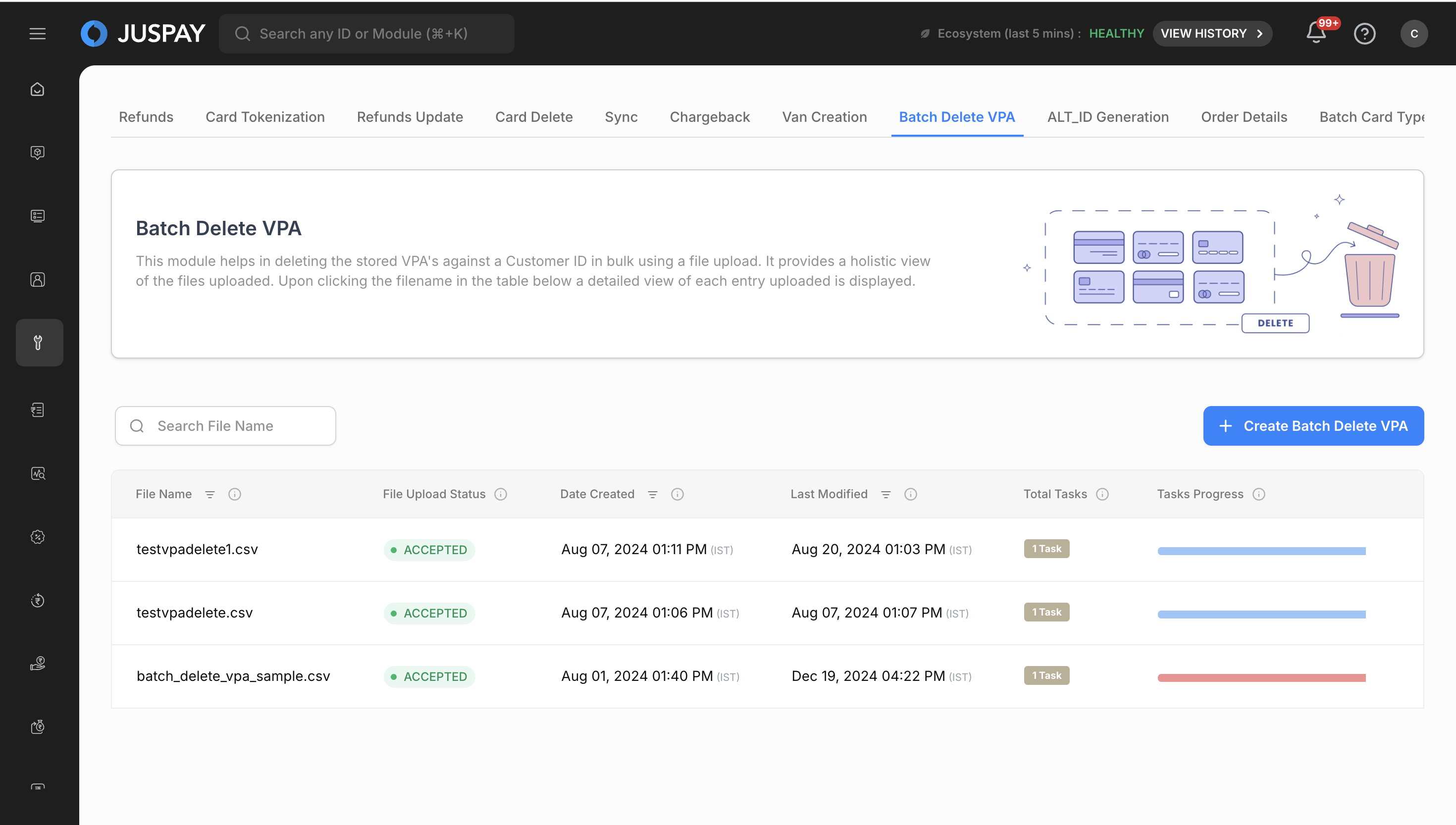 The Batch Delete VPA module provides comprehensive bulk Virtual Payment Address deletion capabilities for processing multiple VPA deletion requests simultaneously through CSV file uploads. It offers real-time progress tracking, status monitoring, and detailed reporting for all VPA deletion operations processed through the Juspay payment platform.