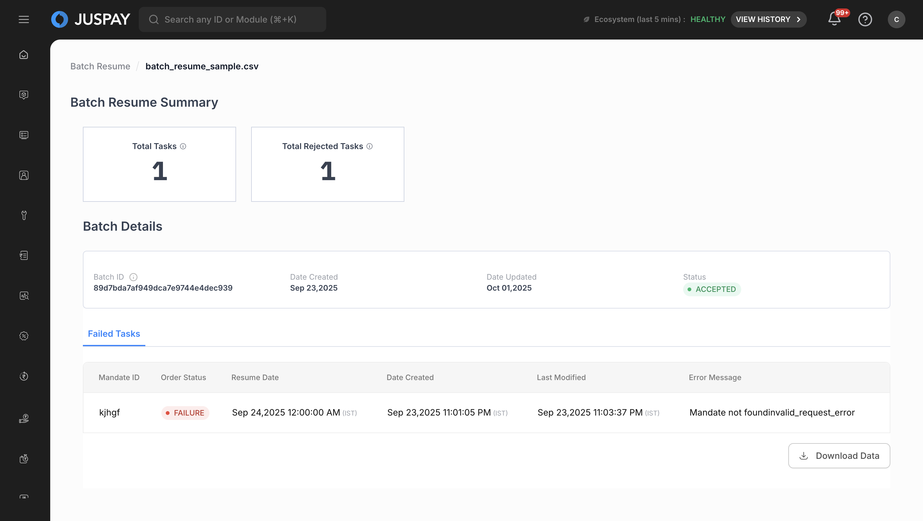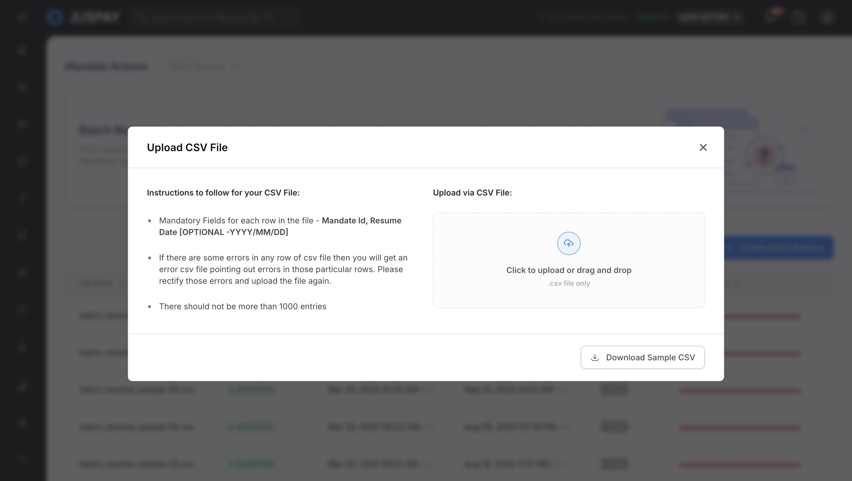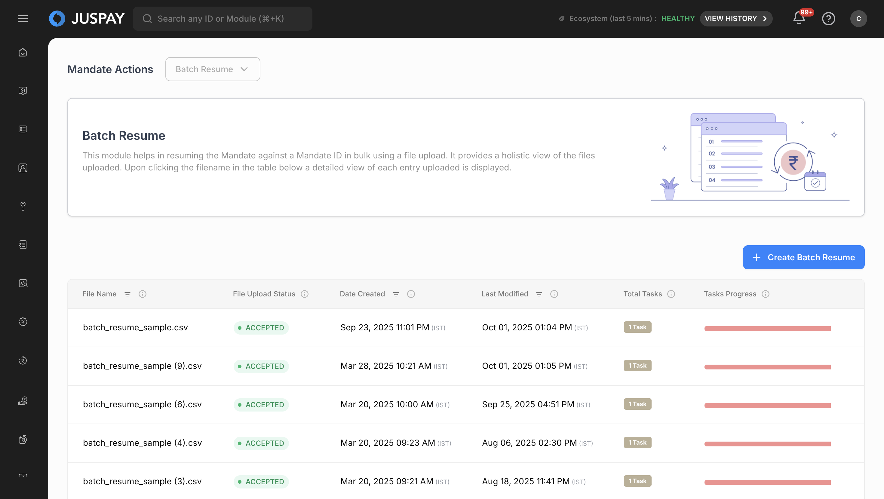 The Batch Resume module provides comprehensive bulk mandate resume capabilities for reactivating multiple paused mandate operations simultaneously through CSV file uploads. It offers real-time progress tracking, status monitoring, and detailed reporting for all mandate resume operations processed through the Juspay payment platform.