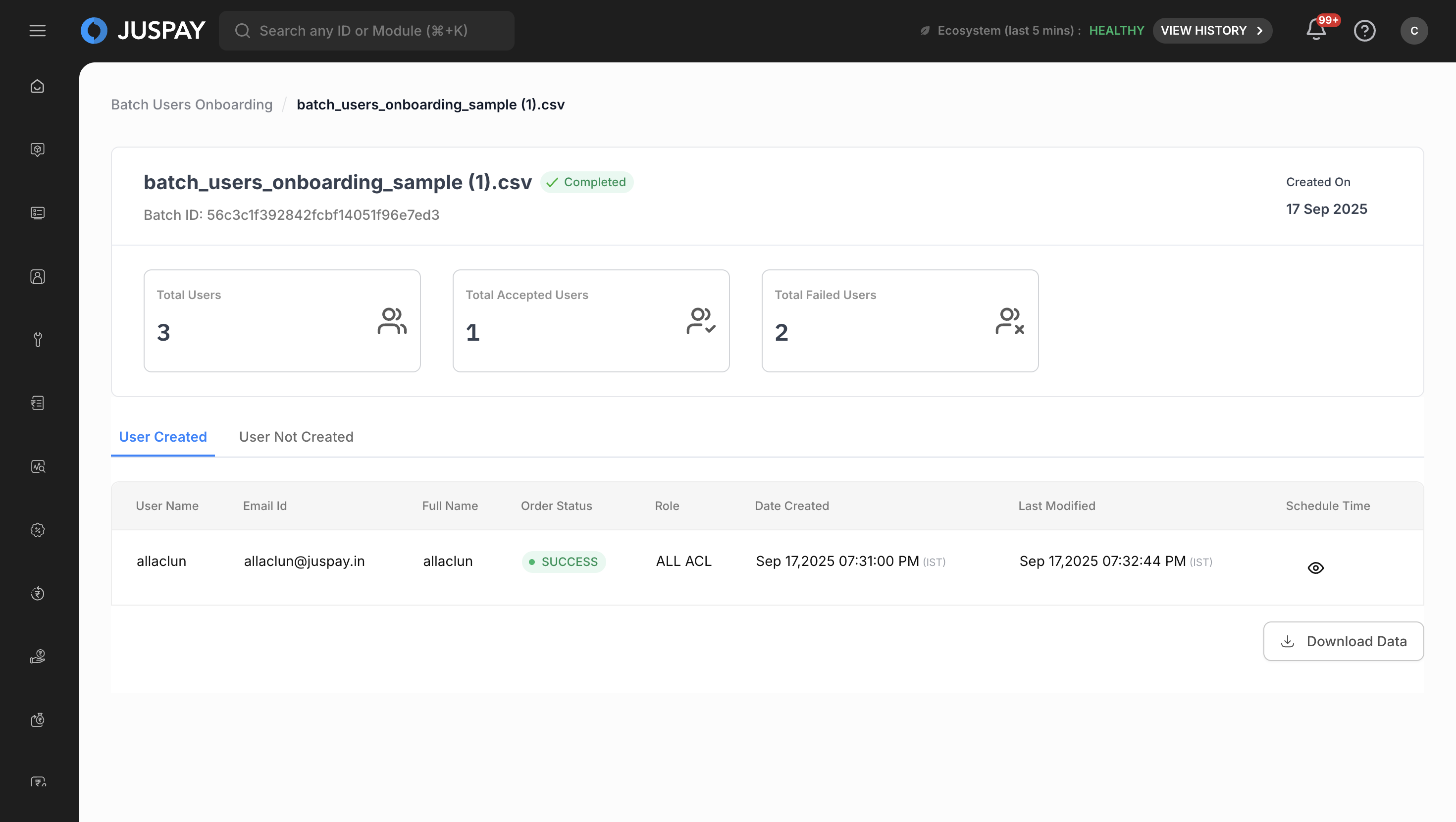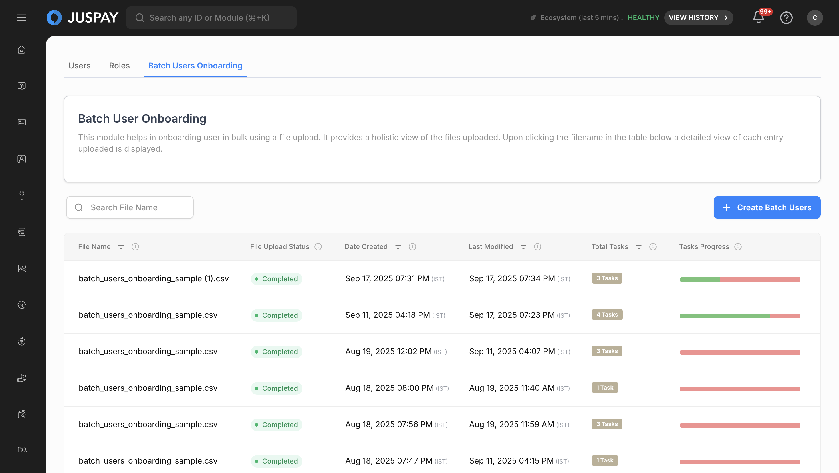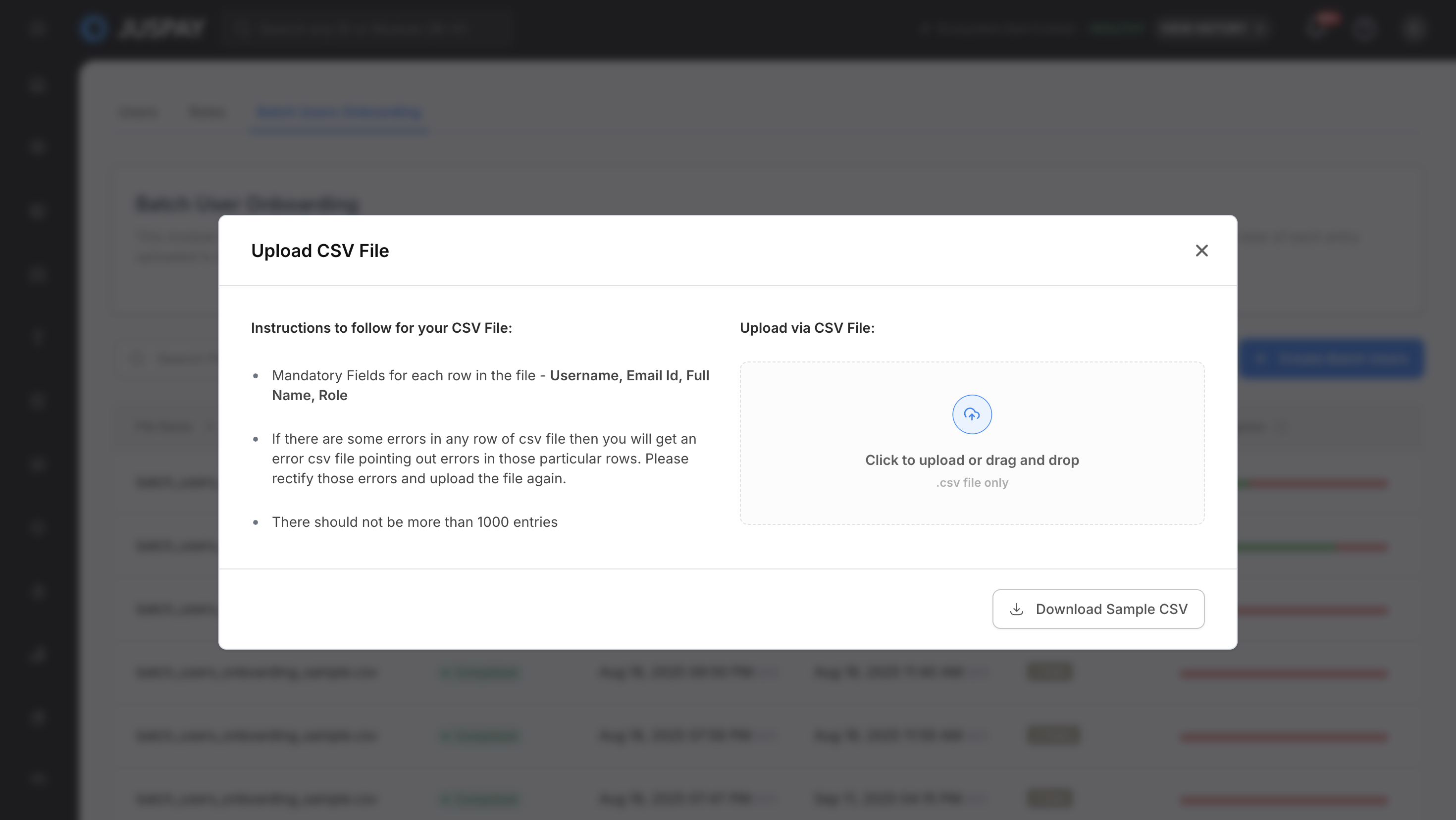 The Batch Users Onboarding module provides comprehensive bulk user creation capabilities for onboarding multiple users simultaneously through CSV file uploads. It offers real-time progress tracking, status monitoring, and detailed reporting for all user creation operations processed through the Juspay payment platform.