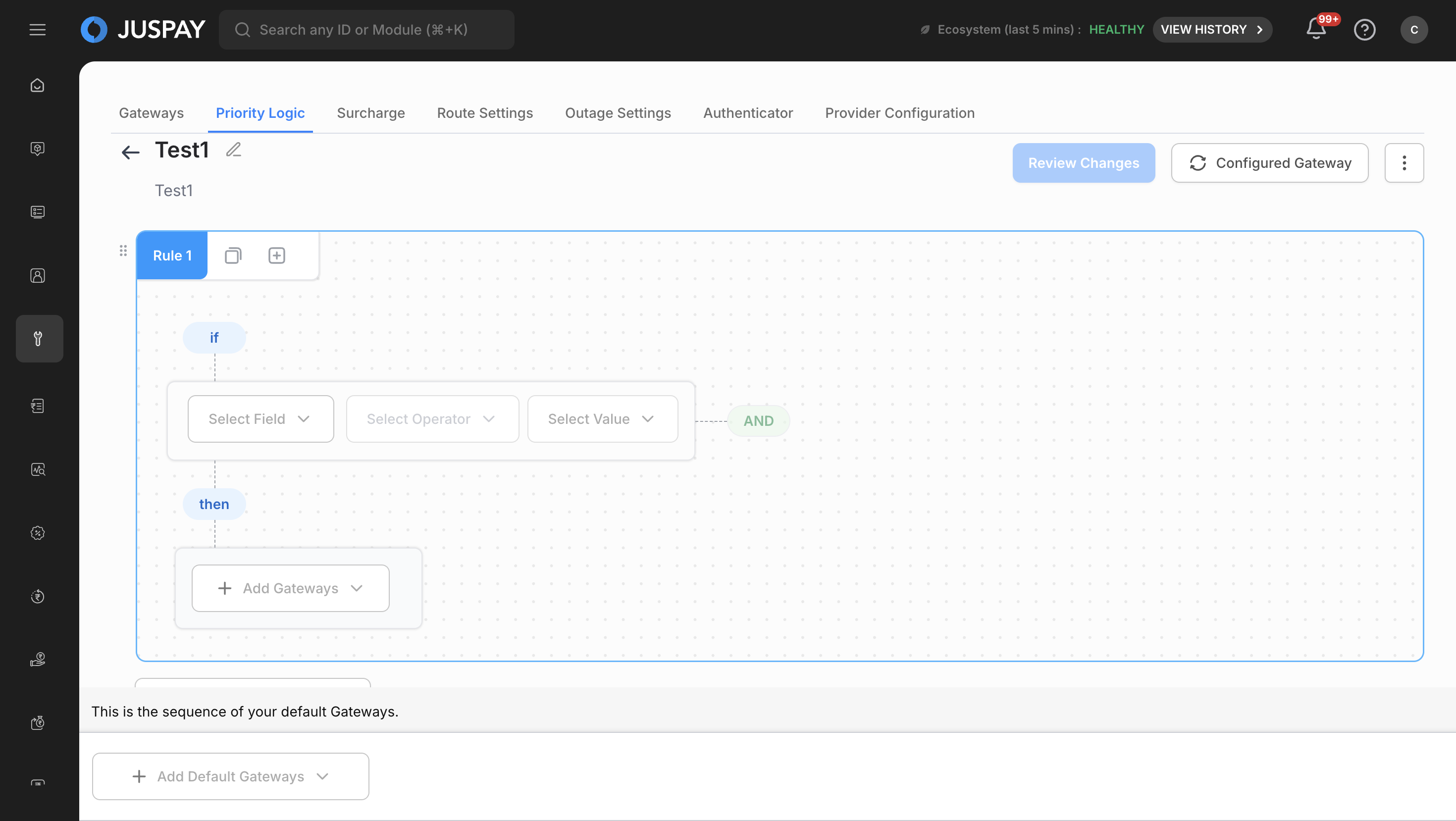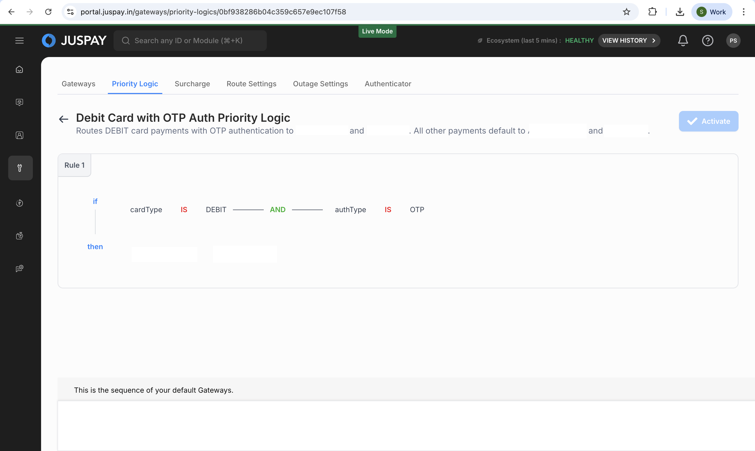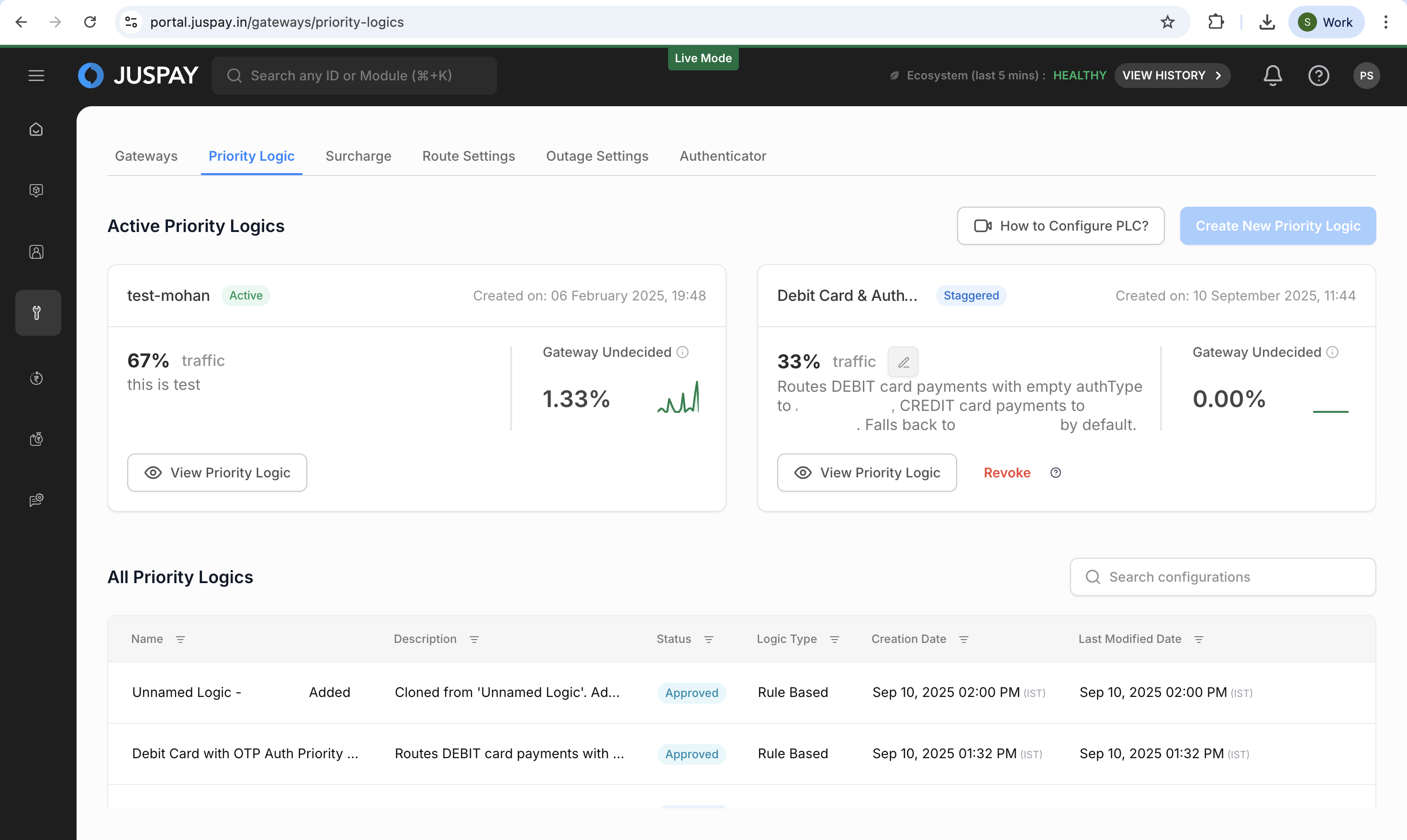 The Priority Logic module provides comprehensive gateway routing and decision-making capabilities for payment processing through the Juspay payment platform. It offers configuration and management tools for setting up intelligent routing rules that determine how transactions are processed across different payment gateways based on various business criteria and performance metrics.