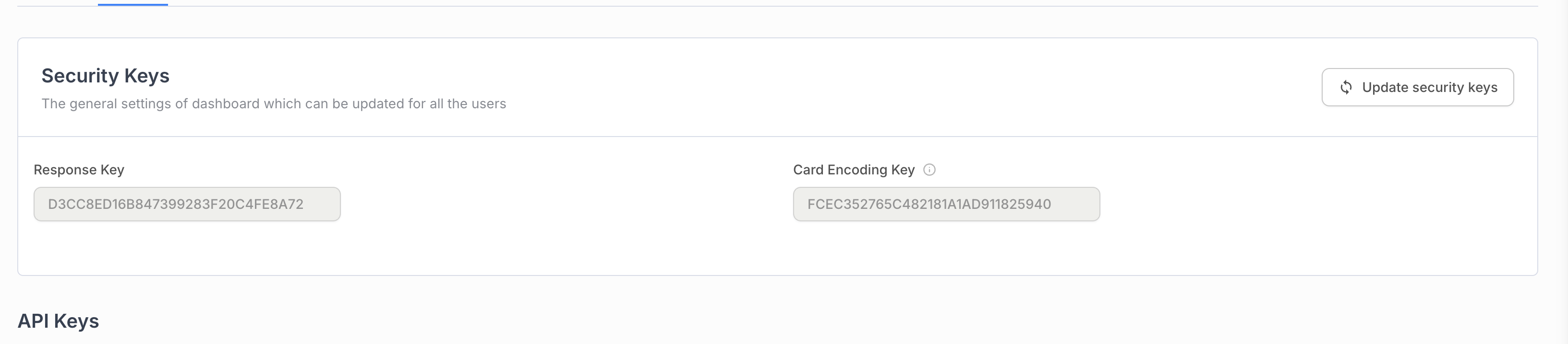 Update Security Keys: Click the "Update security keys" button to generate new security keys. This action requires confirmation.