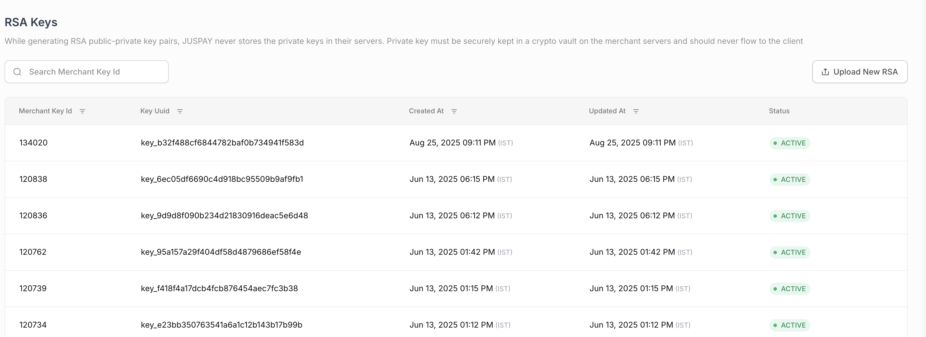The Security Settings module provides comprehensive management capabilities for various security-related configurations within the Juspay payment platform. This includes managing API keys, RSA keys, JWT keys, AES encryption keys, IP whitelisting, and security key management. The module ensures secure authentication, encryption, and access control for payment processing and API integrations.