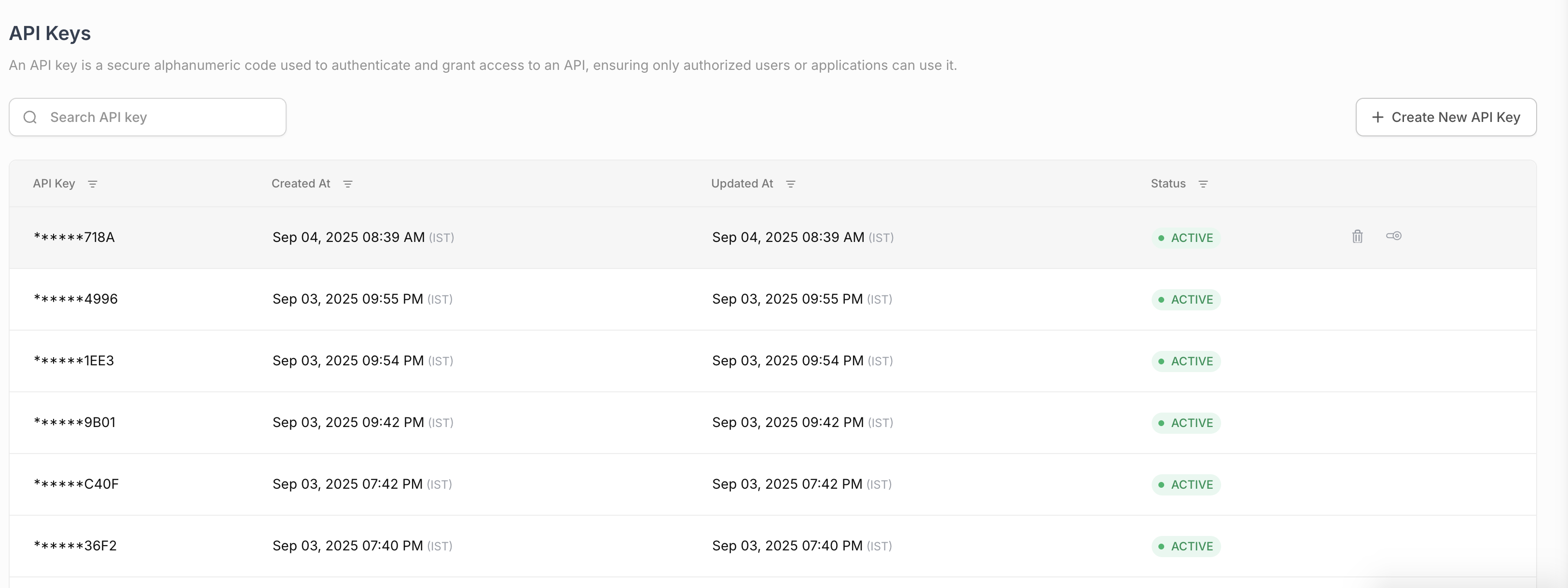To delete an API key, click the delete icon next to the key you want to remove.