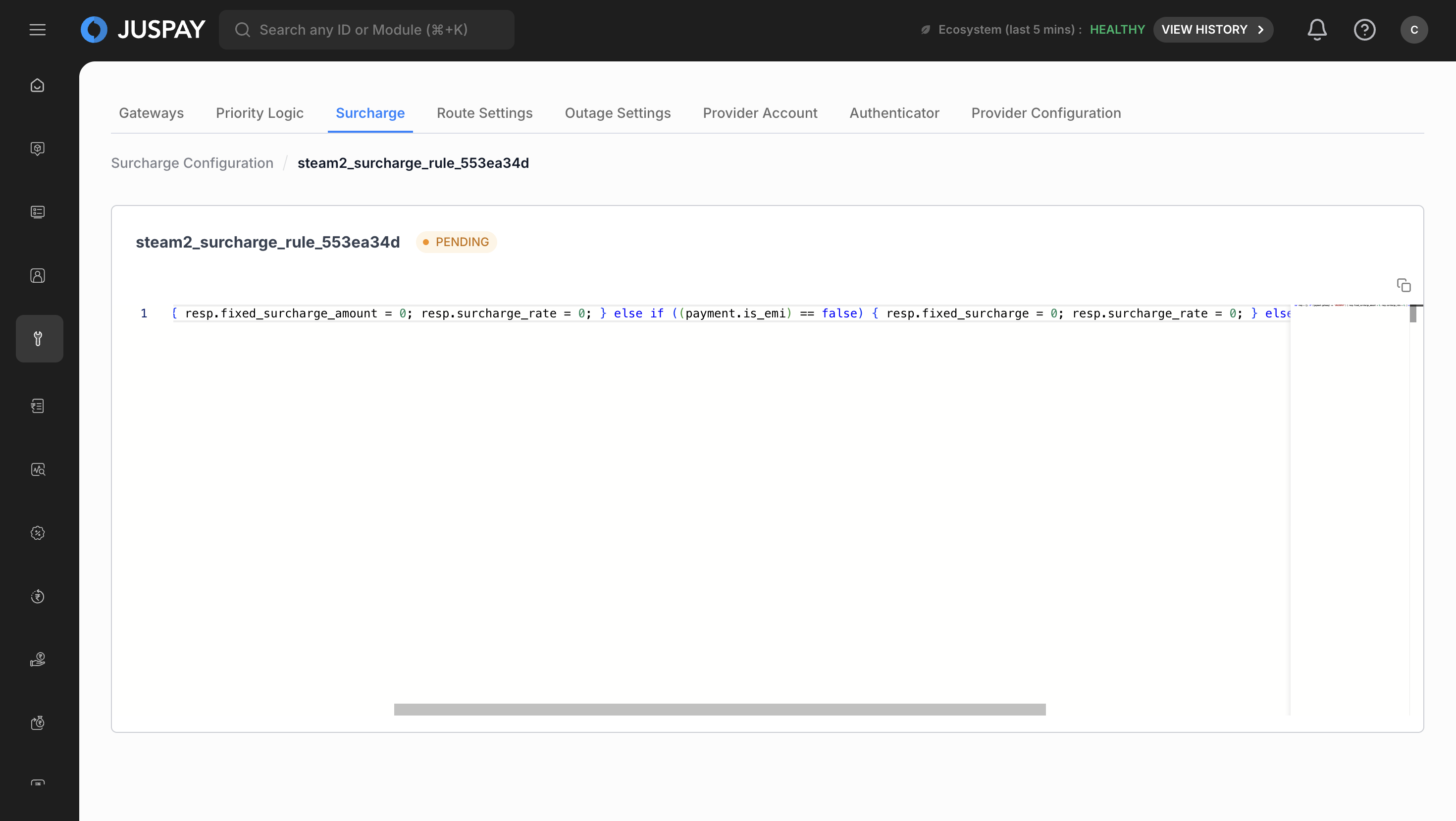 The Surcharge module provides access to fee and surcharge configuration capabilities within the Gateway Management system of the Juspay payment platform. It offers centralized management of surcharge-related settings and configurations for payment processing through an integrated tab interface within the PG Control Center.
