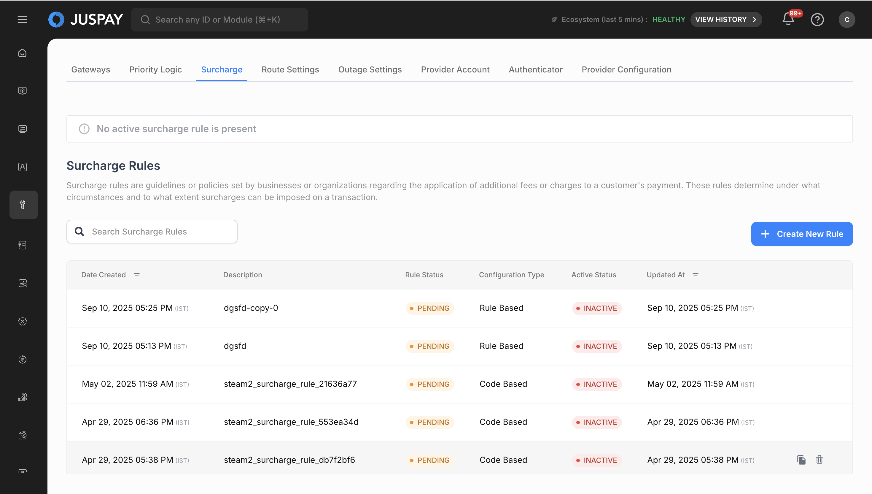 - Rule Status: Shows whether a surcharge rule is currently active or if no active rule is present