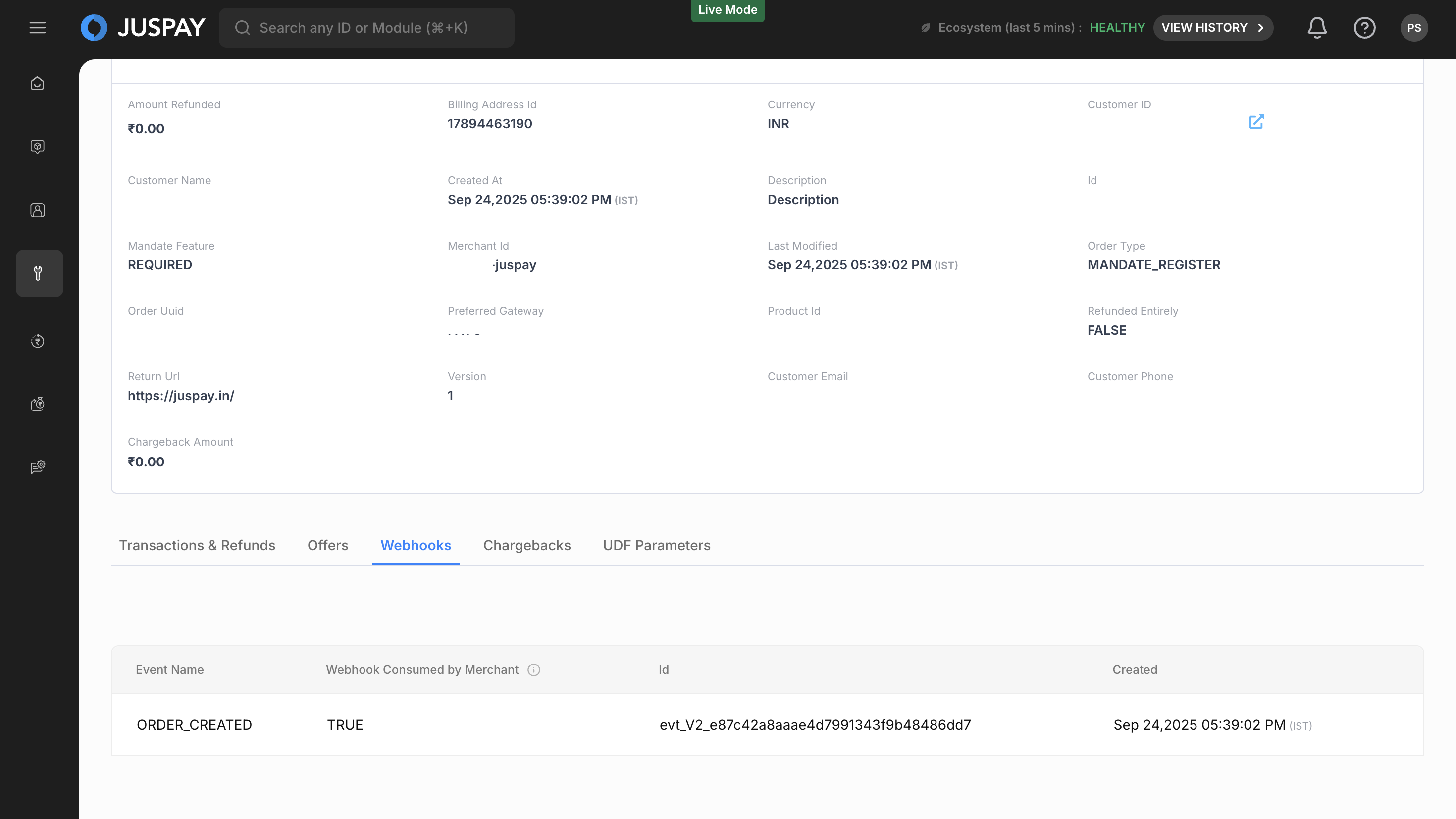 The Webhooks tab allows you to view all webhook events that have been triggered for a specific order. This feature is particularly useful for technical teams and customer support to track webhook delivery status, troubleshoot integration issues, and verify that webhook notifications have been successfully received by merchant endpoints.