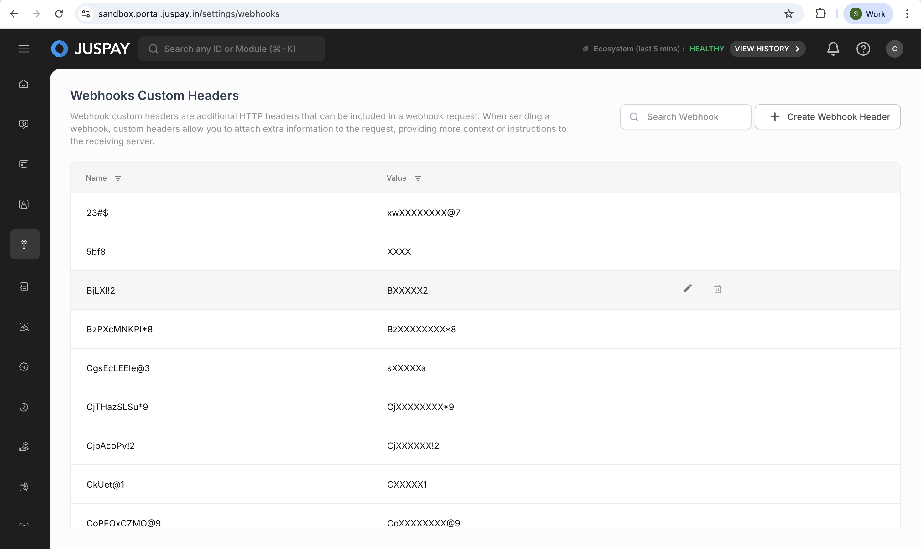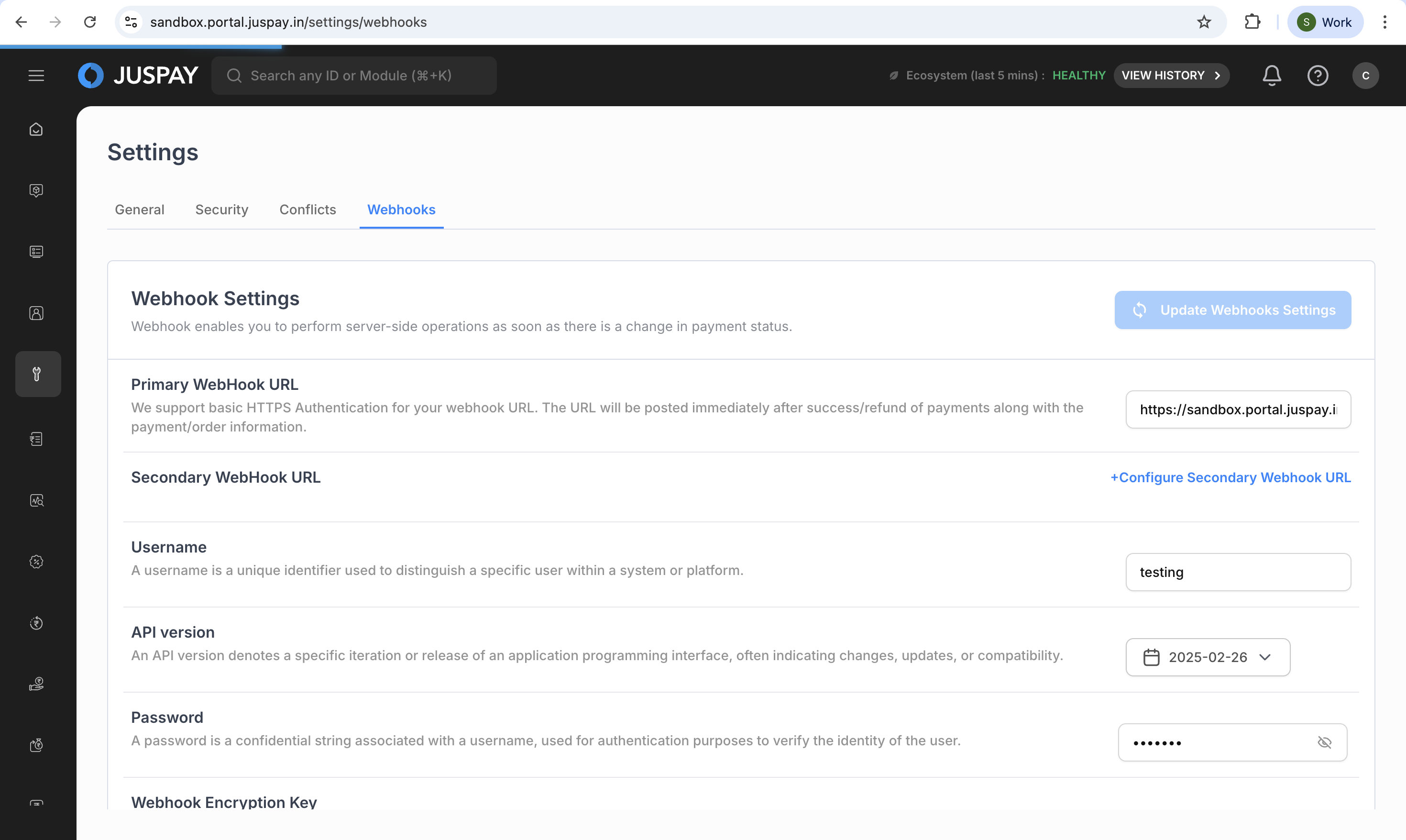 The Webhook Settings module provides comprehensive configuration and management capabilities for webhook endpoints and event notifications within the Juspay payment platform. It enables real-time notification delivery to merchant systems when payment events occur, ensuring seamless integration and automated business process triggers.