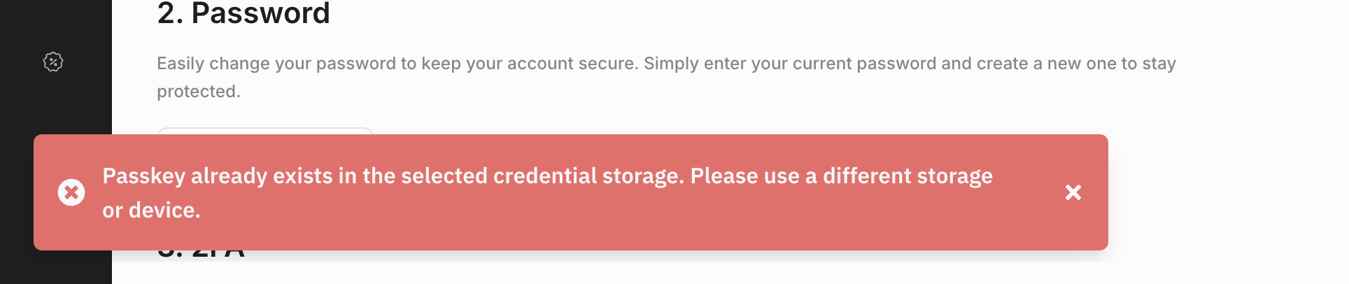 Navigate to the "My Account" section and create a new passkey from there in the same credential storage. This will replace the outdated passkey and resolve the issue.3.2.3 This passkey has been deleted and is no longer valid for login. Please use a different login method and register a new passkey