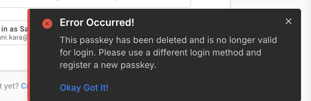 4.2.3 Error: This passkey has been deleted and is no longer valid for login. Please use a different login method and register a new passkey