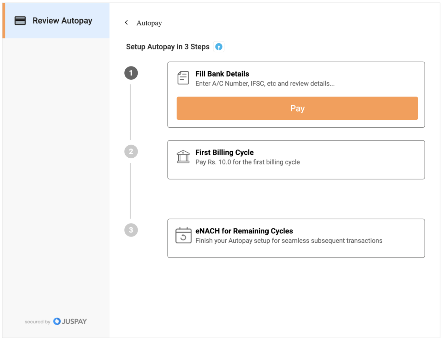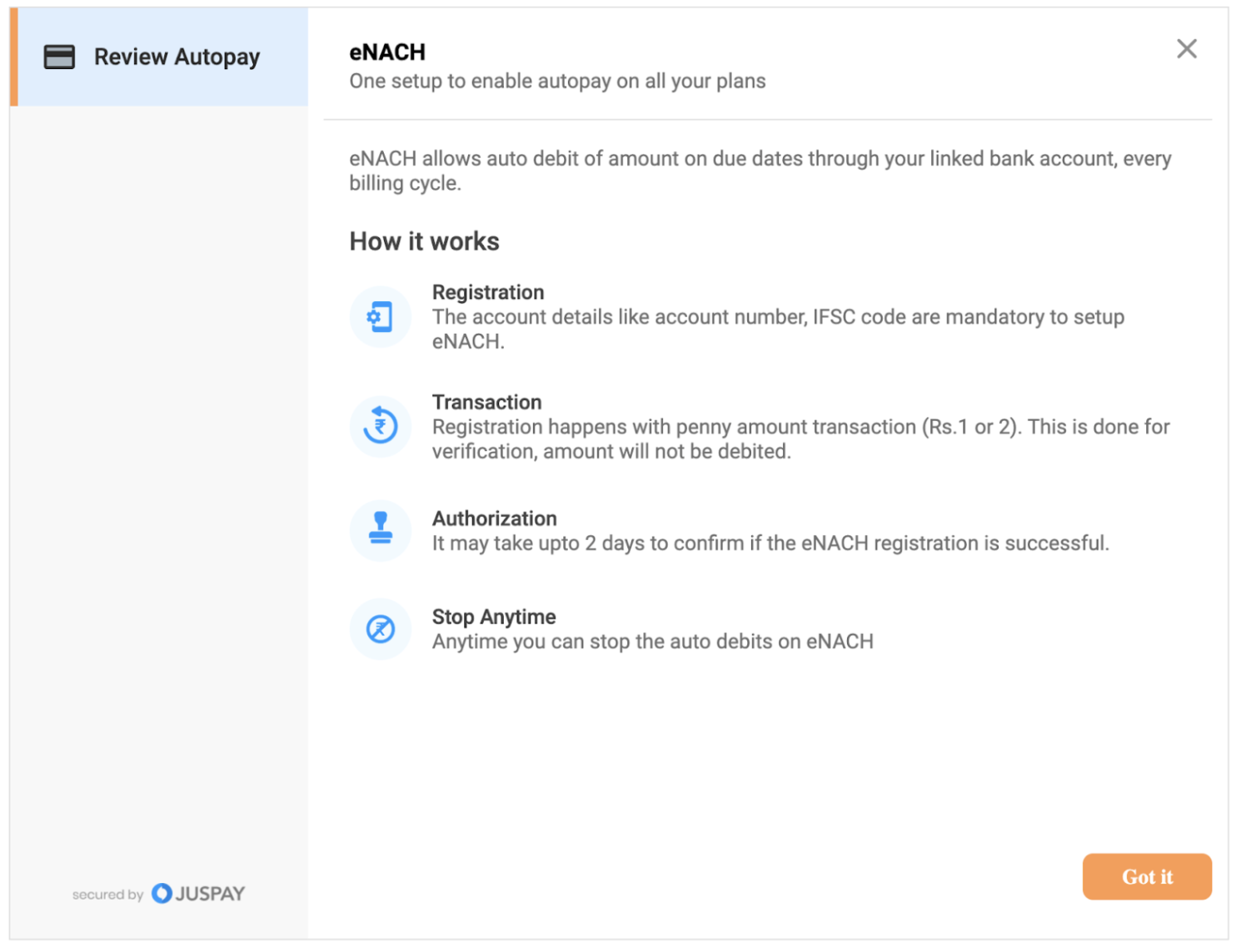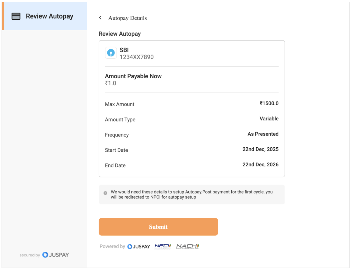 Juspay has enhanced this flow based on merchant requirements to incorporate the first payment debit along with mandate registration. This gives an end to end set up for merchants to use easily without the hassle to extra integration steps.