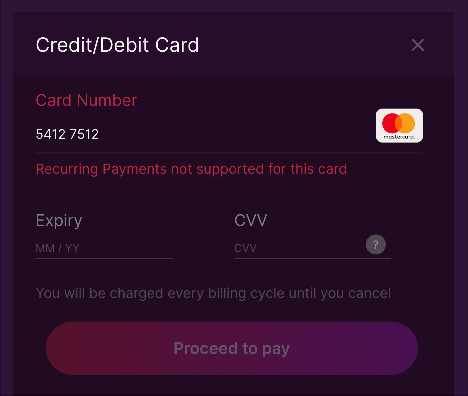 The user will be presented with only the mandate eligible payment methods. The payment details entered by the user will be validated for eligibility for recurring payment. In other words, one-time payment methods will not be allowed.