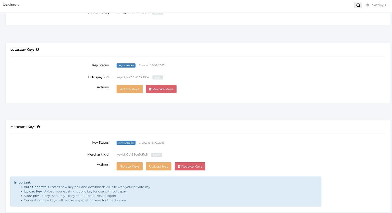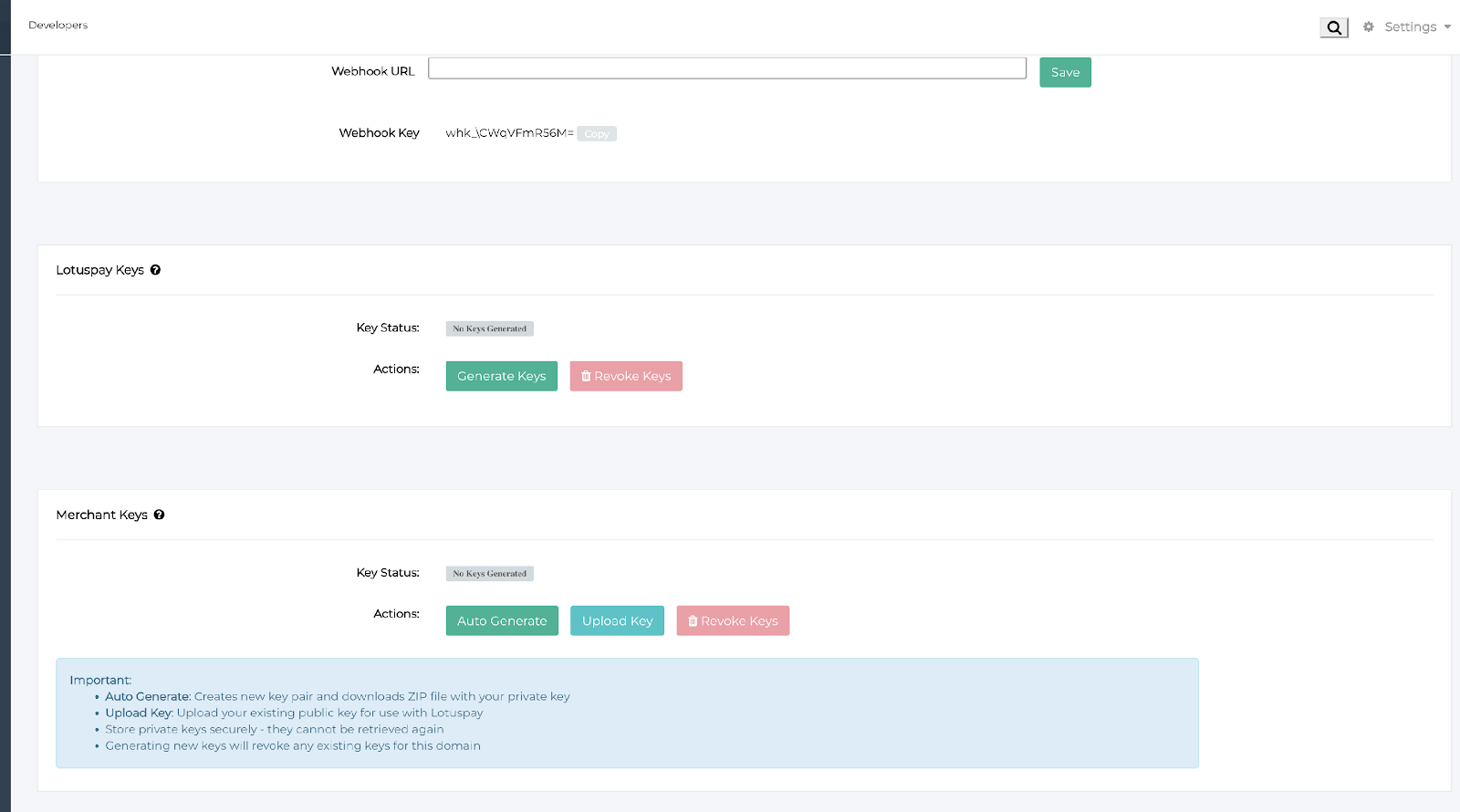 Click Generate Keys. This will produce LotusPay's key pair and provide LotusPay's public key, which is required for AES encryption.