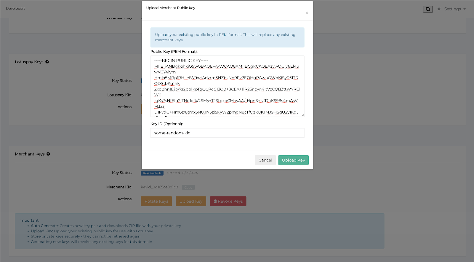 Step 2: Upload your Merchant Public Key to LotusPay.