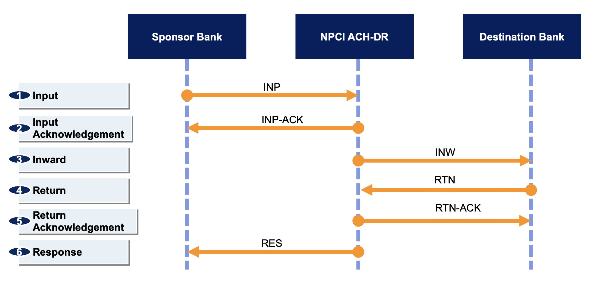 NPCI receives the RTN batches from destination banks, and reorganises them into dedicated response batches for sponsor banks. This is known as RESPONSE (RES). These RES batches match the INP batches that the sponsor bank originally sent.