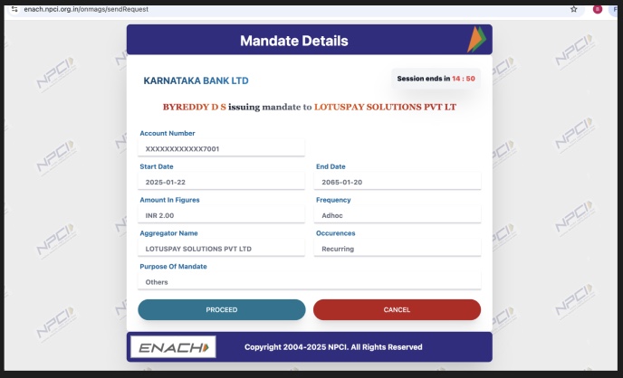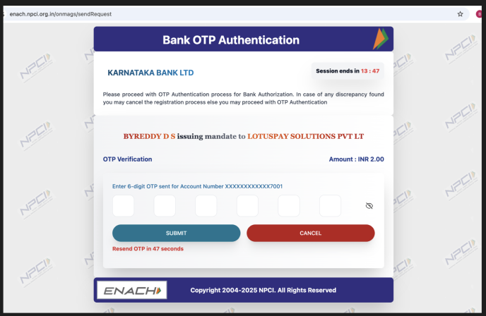 Customers authorise NACH Debit mandates on your branded page on the LotusPay secure site. API eMandates can be authorised via the customer's net-banking login, or debit card and PIN, or Aadhaar number. Customers have to agree to the NACH consent.