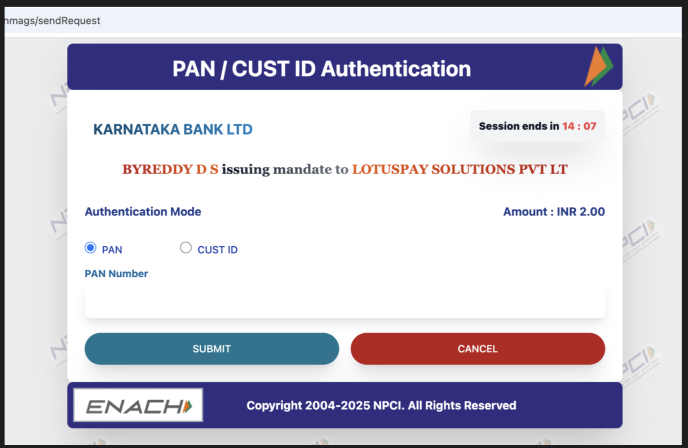 This is simplified mandate flow and is applicable only if the max amount is less than 15000.If the customer selects the Pan/ Customer ID mode of authentication, they will be redirected to the NPCI ONMAGS website. Customers can select either PAN or Cust ID, which is the bank customer ID. If the customer has selected PAN, customer has to enter his PAN. If Cust ID is selected, customer has to enter the Bank customer ID. Then the bank sends an OTP to the customer, and the customer must enter this OTP on the ONMAGS page to authorise the eMandate.