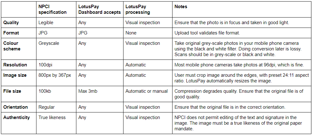 The table below outlines the image specifications for NACH Debit physical mandates. The closer your uploaded image is to the NPCI specification, the less image processing LotusPay has to do, the faster your mandates get submitted to the banking system. LotusPay does most of the image processing automatically, but some aspects need to be done manually and we visually inspect each mandate before submitting it.