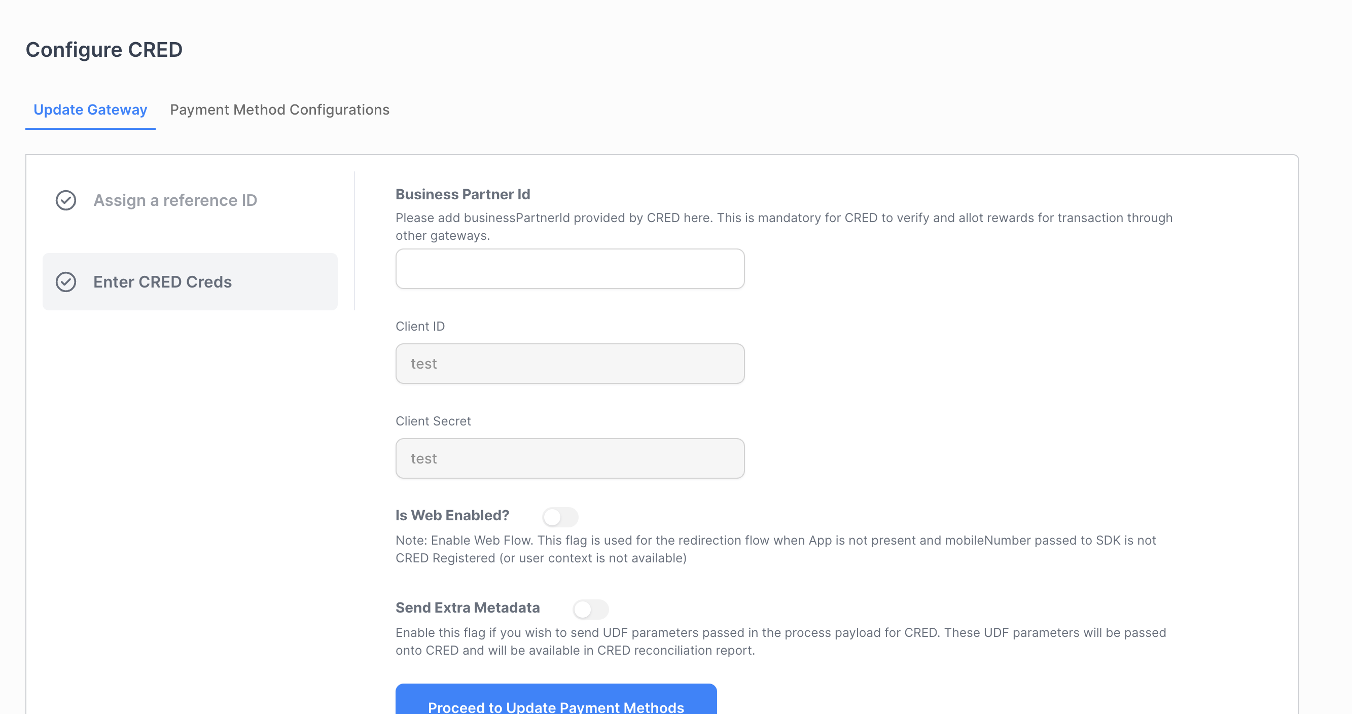 In this step, Merchants would need to add “Business Partner Id“ obtained from CRED Team. Attaching same SS.