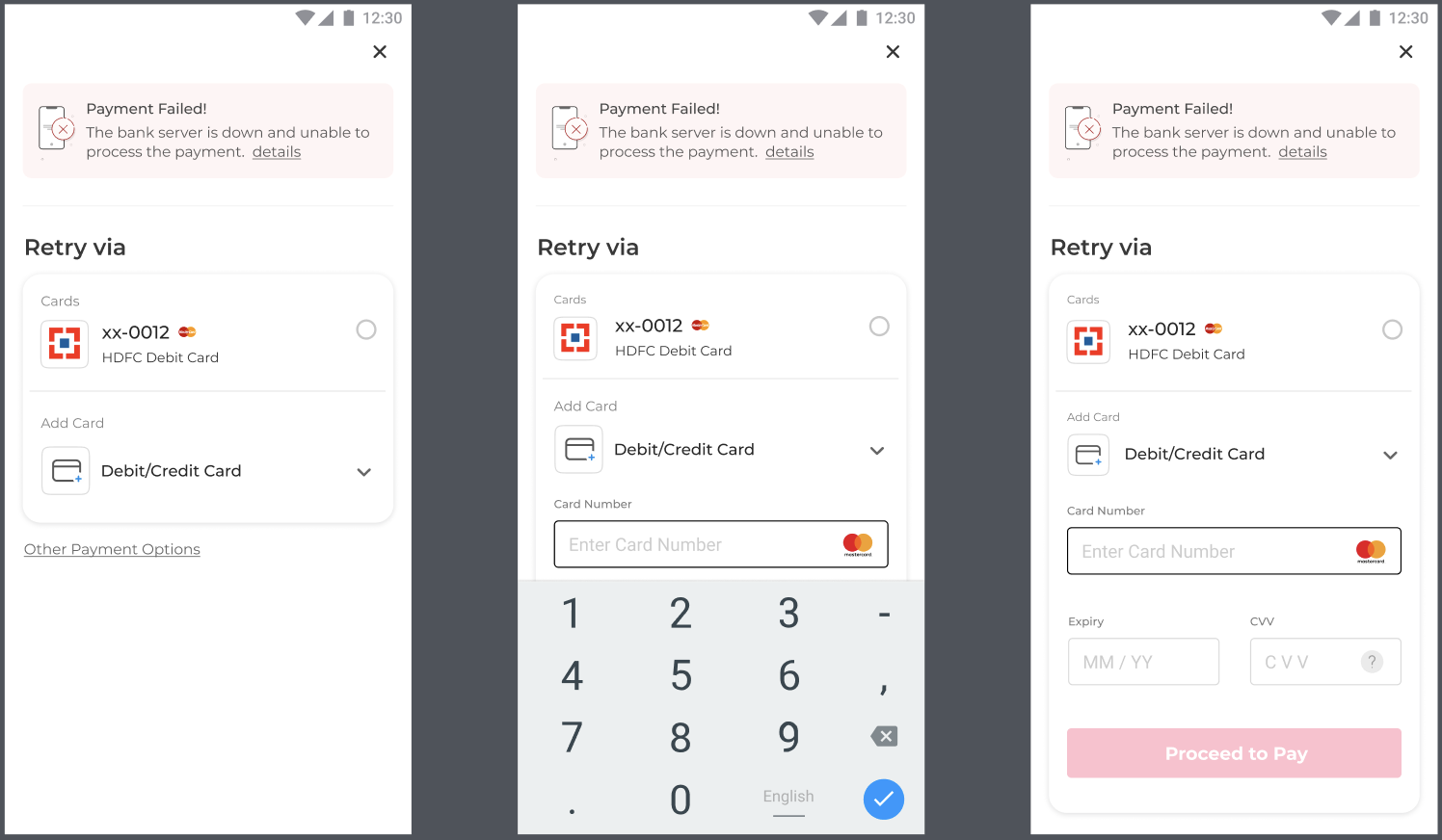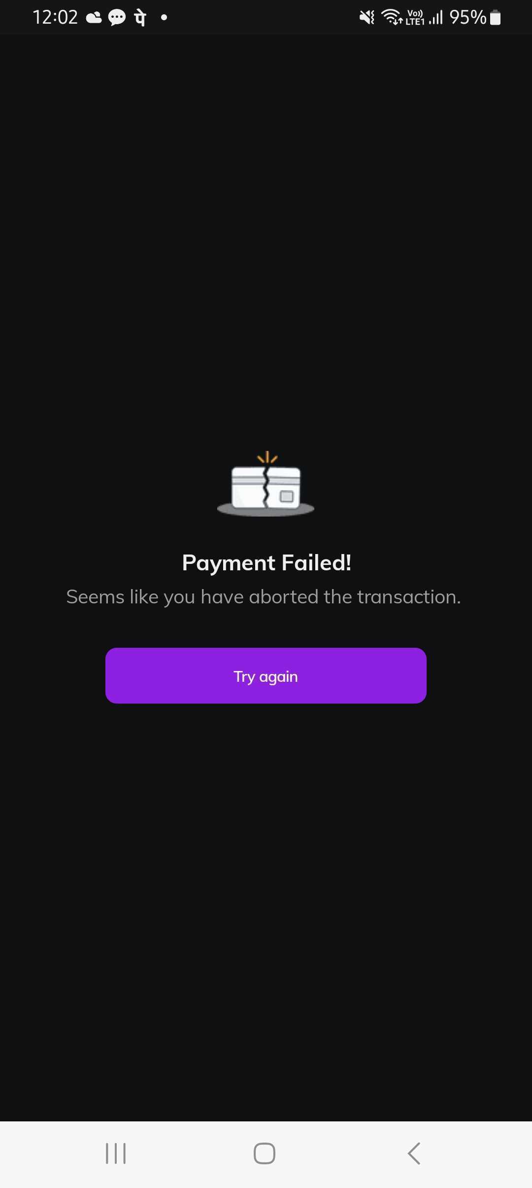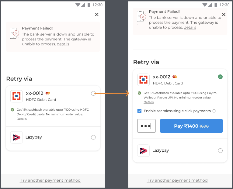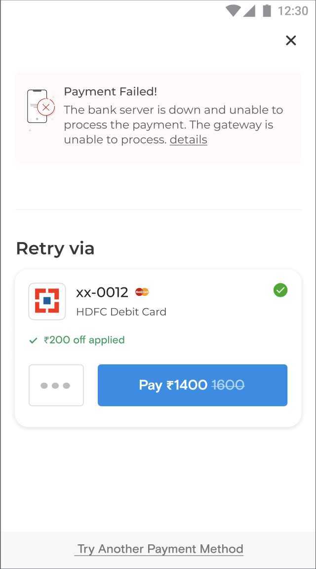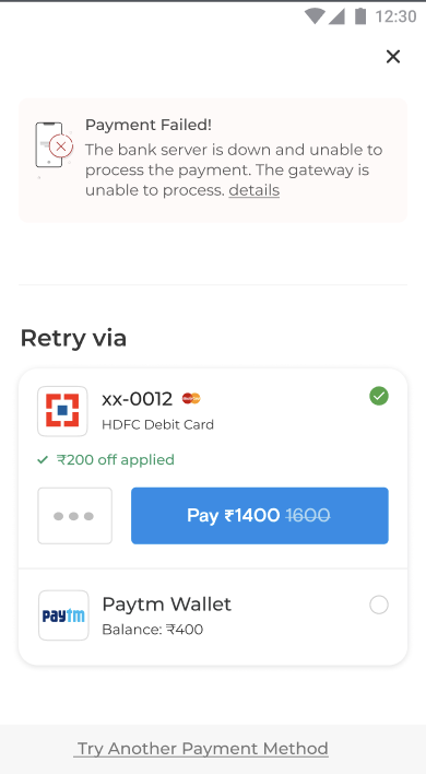 Easy Retention Route: If the user presses back, cancels the retry pop-up, or selects "Try with another payment method," they will be seamlessly navigated back to the payment page with all available payment options, ensuring a smooth and flexible user experience.