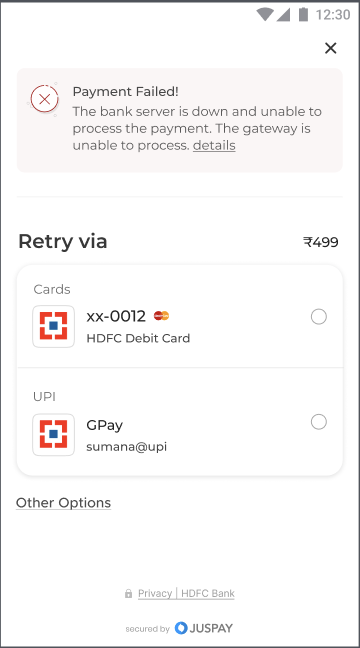 Downtime or Fluctuation: Payment methods experiencing downtime or technical fluctuations will not appear on the retry screen, preventing users from selecting options that may result in further delays or failures.