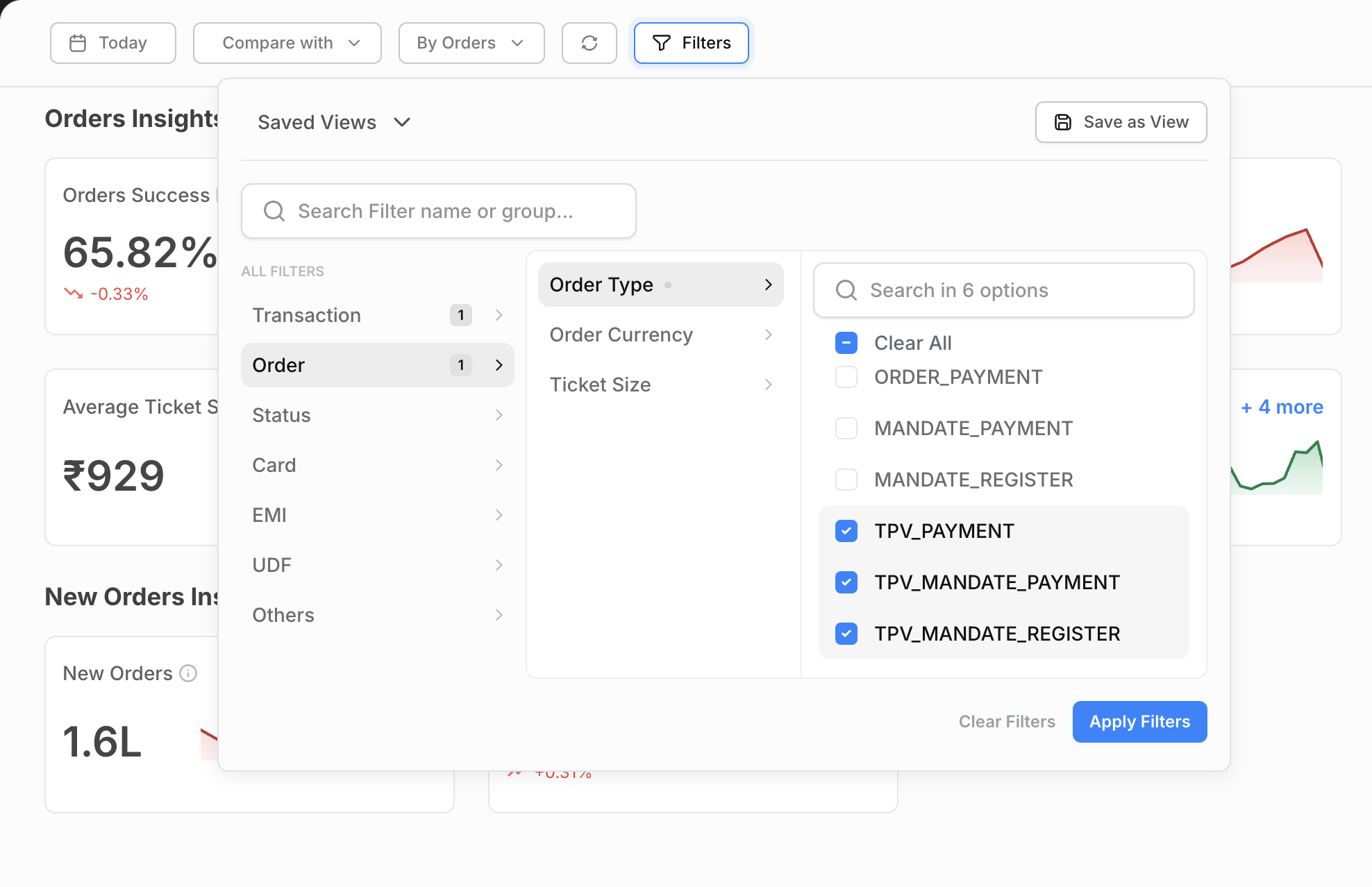 Use Order Type filter and select TPV_PAYMENT / TPV_EMANDATE_PAYMENT(for TPV recurring payments) / TPV_EMANDATE_REGISTER(for TPV registration payments) on the Juspay Transaction Analytics Dashboard for reviewing the Volume and SR at Order level.