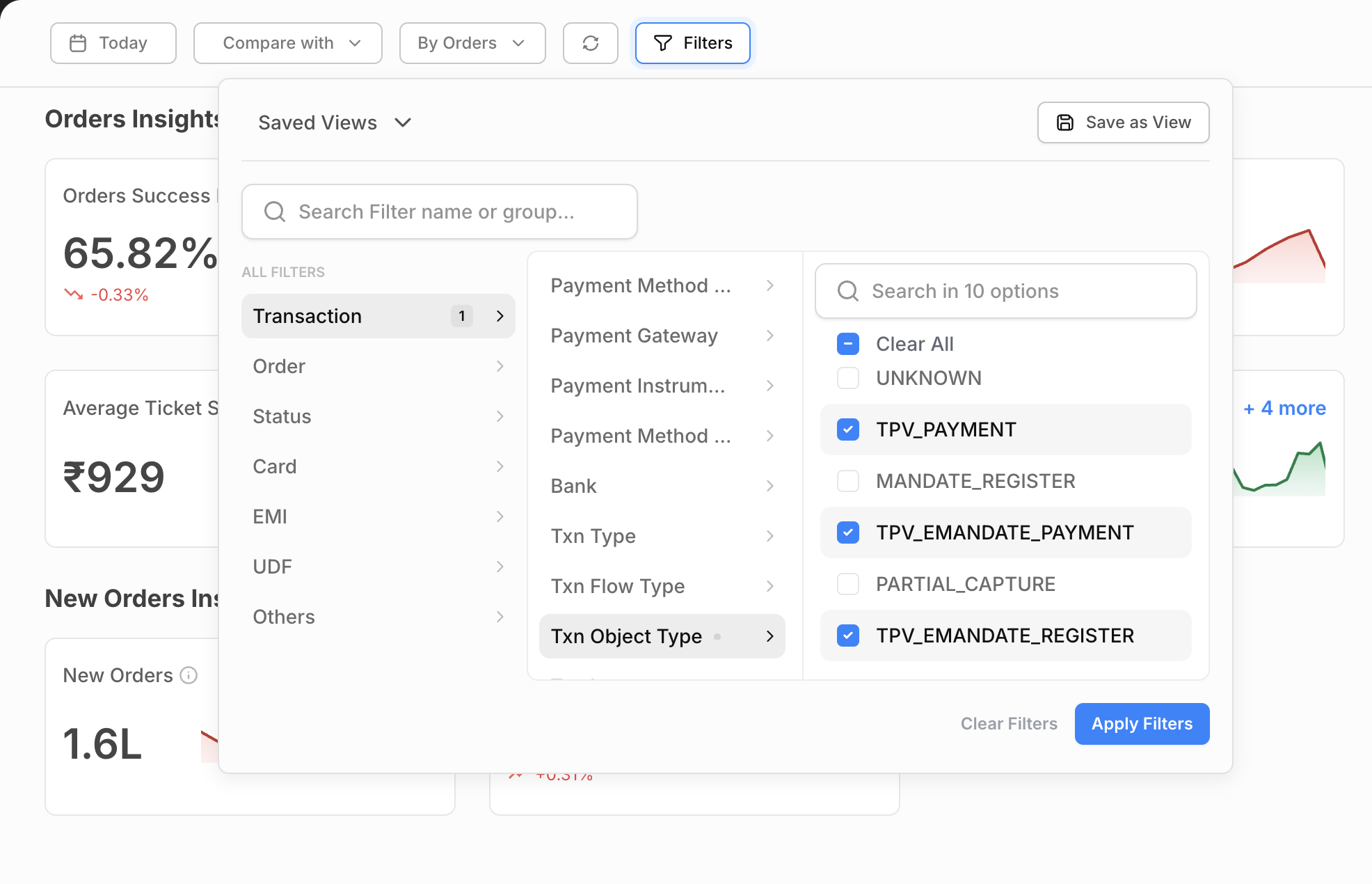 Use TPV Txn Object Type filter and select TPV_PAYMENT / TPV_EMANDATE_PAYMENT(for TPV recurring payments) / TPV_EMANDATE_REGISTER(for TPV registration payments) on the Juspay Transactions Analytics Dashboard for reviewing the Volume and SR for TPV transactions.